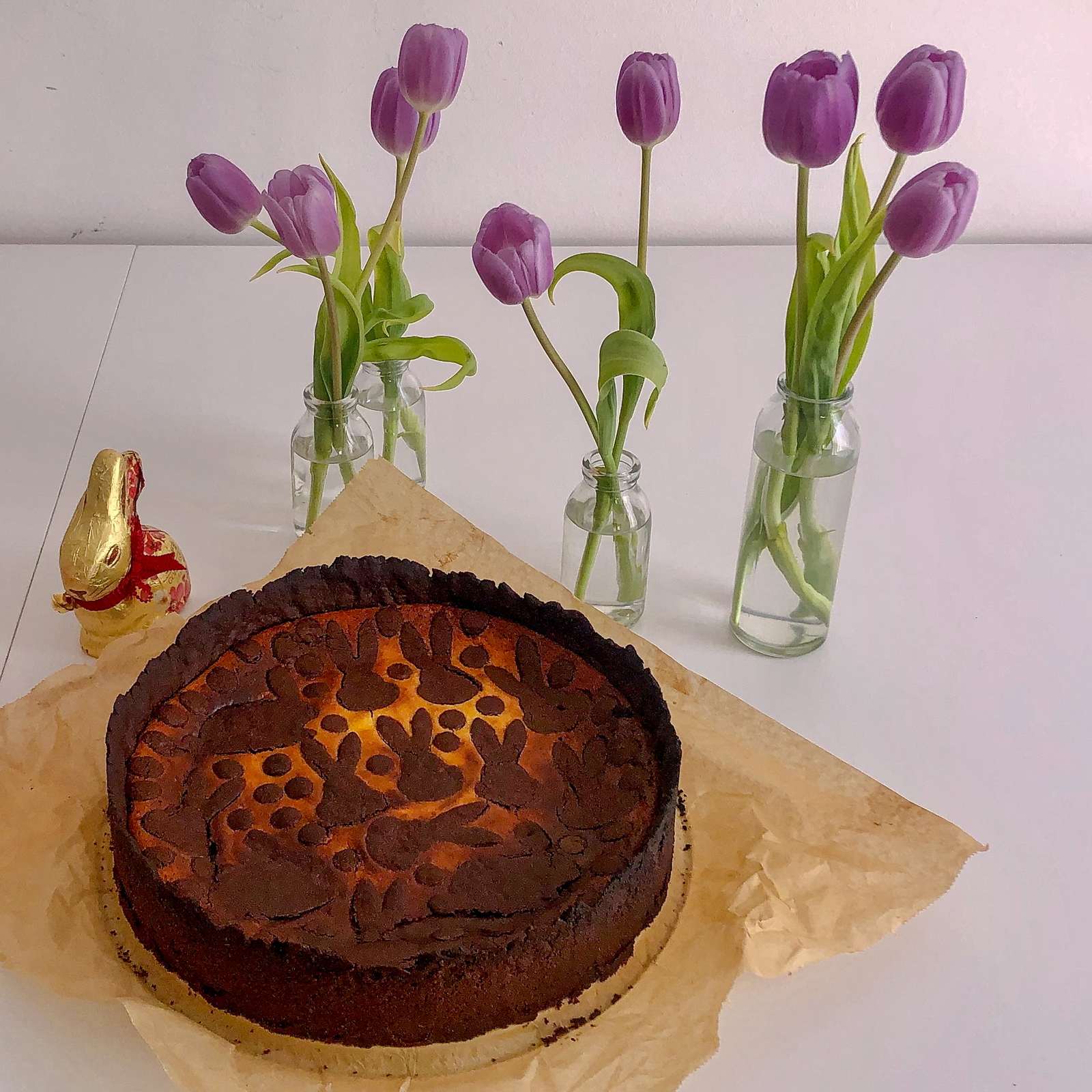 - Die Teigreste in Teile zerreißen und vorsichtig auf der Füllung verteilen. Für die Easter Version alternativ den Teigrest ausrollen und kleine Hasen ausstechen.